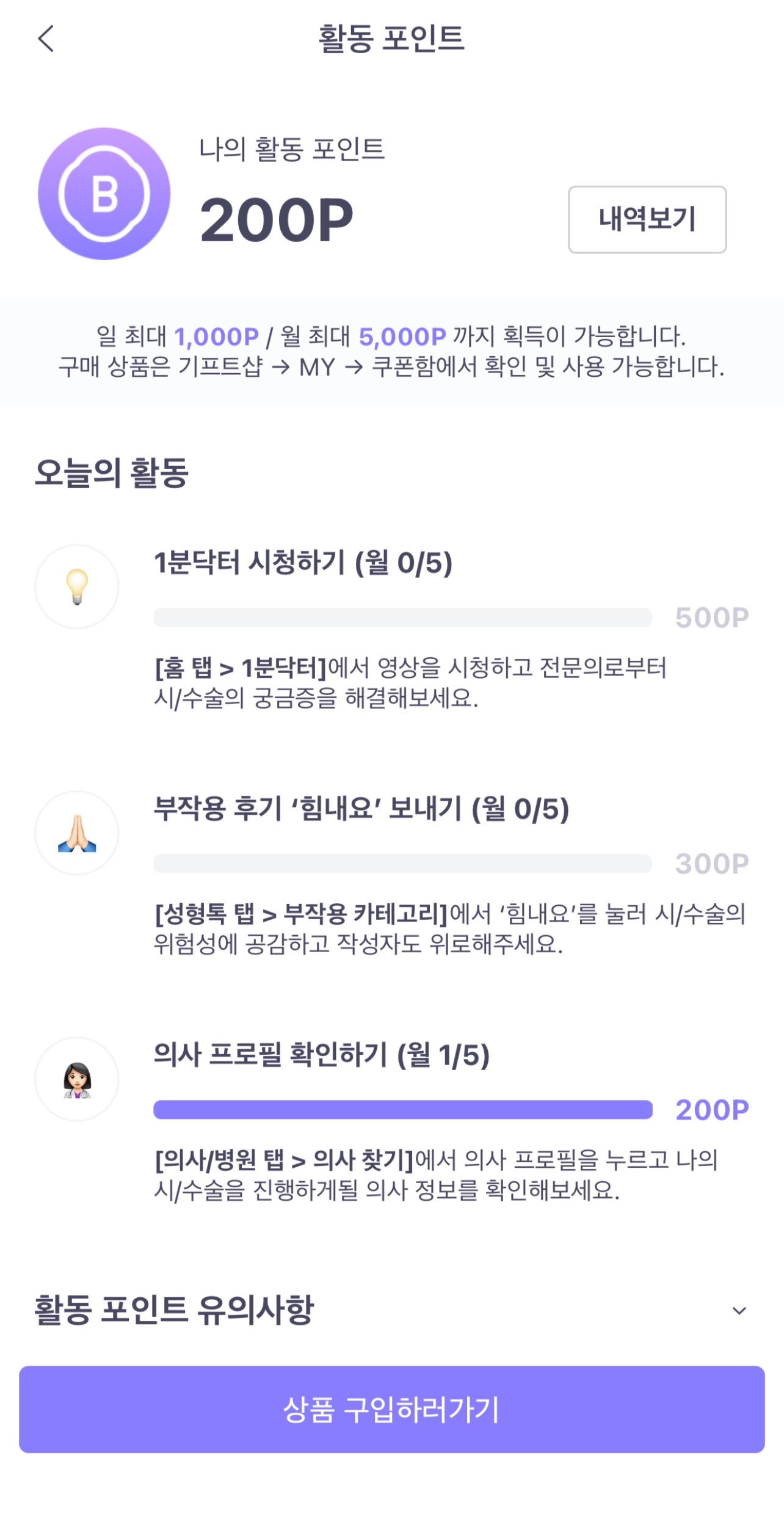 먼저 안드로이드와 아이폰 스토어에서 바비톡을 검색한 후 앱을 설치하고 회원가입까지 진행해주세요. 회원가입은 애플, 카카오톡, 네이버, 이메일 등 다양한 채널에서 연동이 가능하며 휴대폰 인증까지 해야 합니다. 저는 네이버 아이디로 연동했는데 닉네임 설정 등 프로필 설정 단계가 있기 때문에 연동된 네이버 아이디가 유출될 염려는 없겠더라고요. 회원가입까지 마친 후 홈 화면 우측 상단에 위치한 사람 모양을 눌러주세요. 그리고 여기서 활동 포인트로 들어갑니다. 포인트는 일 최대 1,000P로 시작해서 월 최대 5,000P까지 획득이 가능하기 때문에 한 달에 5일만 꾸준히 들어와도 커피 한 잔정도는 마실 수 있습니다. 바로 포인트 획득 방법에 대해 차근차근 소개해보겠습니다. 첫 번째는 1분 닥터 시청하기입니다. 홈 탭으로 이동하면 중앙 부분에 1분 닥터를 볼 수 있습니다. 1분 닥터에서 소개된 영상을 시청하고 전문의로부터 시술과 수술의 궁금증을 해결하면 500P를 얻을 수 있습니다. 1분 닥터는 이용자들에게 받은 성형 시술과 수술 관련 질문을 전문의가 1분 동안 답해주는 영상 콘텐츠로 1분만 시청하고도 500P를 받을 수 있으니 고작 1분만 투자해도 500P를 받을 수 있다는 것이 흥미롭죠. 두 번째는 부작용 후기 '힘내요' 보내기입니다. 이번엔 홈 화면 하단 두 번째 탭에 위치한 성형 톡 탭에서 부작용 코너로 들어간 후 부작용에 대해 올라온 글에 힘내요 버튼을 클릭하면 300P를 획득할 수 있습니다. 힘내요 버튼은 하단에 위치한 이모지로, 이것만 누르면 자동으로 300P가 들어옵니다. 보통 다양한 SNS 채널에 미용과 성형에 관한 홍보글이 많이 올라오며 신뢰를 져버리는데 바비톡은 부작용톡도 올라와있어 한 번 더 신뢰도를 쌓는 거 같습니다. 세 번째는 의사 프로필 확인하기입니다. 이번엔 홈 화면 하단에서 의사/병원 탭으로 들어갑니다. 그리고 의사 찾기에 뜨는 의사 프로필을 선택하고 정보를 확인하면 200P를 얻을 수 있습니다. 여기까지 미션을 수행하면 하루에 1분만 투자해도 1,000P를 획득할 수 있으니 완전 효자 앱이라고 할 수 있습니다. 이렇기 적립한 포인트는 바비톡 기프트샵에서 모바일 상품권으로 교환하여 상품을 구매할 수 있습니다. 교환처는 파리바게트, 스타벅스, 편의점 등 있어 다양한 곳에서 사용할 수 있습니다.
