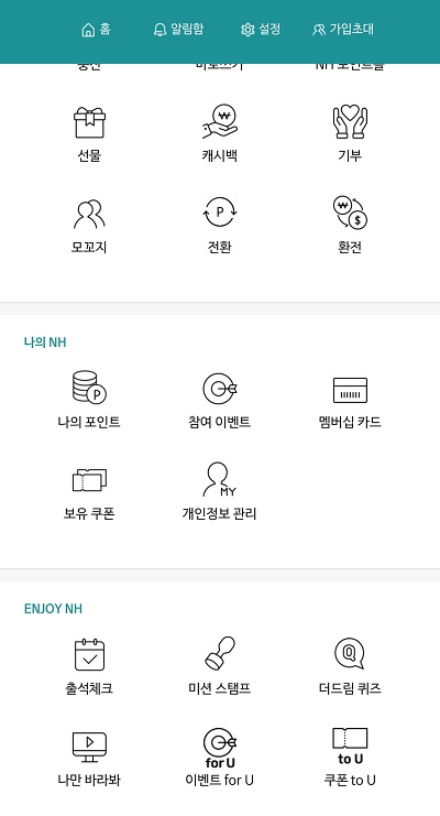 농협도 관련된 앱이 굉장히 많았습니다. 앱 스토어에서 NH멤버스라고 검색하면 쉽고 빠르게 설치가 가능하며 안드로이드, 아이폰 둘 다 가능합니다. 설치 후 회원가입을 진행합니다. 네이버, 페이스북, 카카오톡 등 간편 가입이 가능하나 은행권 앱 가입이라 어차피 본인인증이 필요할 거 같아 저는 그냥 회원가입으로 아이디를 생성했습니다. 홈 화면에서 우측 상단 메뉴탭으로 들어가면 ENJOY NH 카테고리를 볼 수 있습니다. 여기서 포인트 획득이 가능한데 첫 번째는 출석체크입니다. 매일매일 출석체크 당일 출석에 해당하는 포인트는 당일 지급됩니다. 2021년 출석체크 이벤트는 출석체크 시 2P가 지급되어 30일 출석 시 총 60P를 받을 수 있습니다. 작년까지만 해도 누적 포인트도 줬는데 아무래도 앱 이용자들이 많아지다 보니 대체적으로 이벤트가 많이 줄어들고 있습니다. 두 번째는 더드림 퀴즈입니다. 더드림 퀴즈는 10일에 한 번 오픈되며 10일 동안 한 번 참여할 수 있습니다. 좋은 점이 있다면 퀴즈는 정답을 맞힐 때까지 도전할 수 있습니다. 문제는 보통 NH계열사 관련하여 나오는 편입니다. 2021년 3월 22일부터 3월 31일까지 진행되는 NH저축은행 퀴즈 편, NH 저축은행의 NH멤버스 회원 대상으로 출시한 상품은 무엇인가? 에 대한 답은 NH멤버스입니다. 답을 맞히면 룰렛이 나옵니다. 룰렛엔 1P, 2P, 5P, 10P, 1,000P, 5,000P까지 있고 랜덤으로 지급됩니다. NH멤버스 앱을 출시했을 당시엔 5,000P 많이 줬는데 요즘엔 1P만 나와서 우울합니다. 그리고 매일 올라오거나 매주 올라오는 타 퀴즈앱에 비해 열흘 동안 진행하는 NH멤버스 더드림 퀴즈는 주기가 길어서 아쉽습니다. 세 번째는 나만 바라봐입니다. 나만 바라봐는 보고 또 보고 매일매일 광고를 끝까지 보면 룰렛을 돌릴 수 있습니다. 광고는 월 초에 한 번 변경되지만 같은 광고를 매일 볼 수 있습니다. 어떤 달은 유튜브 광고가 올라오고 어떤 달은 이미지만 올라오는데 6초 정도 확인하면 포인트 받기가 생성됩니다. 포인트 받기를 터치하면 또 룰렛이 나오는데 이번 룰렛도 최소 1P부터 최대 5,000P까지 받을 수 있습니다. NH멤버스는 무조건 룰렛으로 포인트를 주는데 이게 어떻게 보면 좋기도 하고 저 같은 똥손은 안 좋은 거 같습니다. 다른 분들은 1,000P 당첨도 잘 되는데 저는 왜 항상 1P만 받을까요. 여기까지 NH멤버스에서 매일 진행이 가능한 포인트 획득 서비스입니다. 그렇다면 적립한 포인트는 어떻게 사용이 가능한지 알려드리겠습니다. 먼저, 또래오래, 불고기브라더스, 토다이 등 가맹점에서 바로바로 NH포인트로 결제가 가능합니다. 두 번째는 NH포인트몰에서 SKT 휴대폰 요금, 데이터쿠폰, 단말 할인 등을 포인트로 사용할 수 있습니다. 세 번째는 NH멤버스 회원에게 선물로 전달이 가능하며 모꼬지를 통해 여러 구성원이 한 사람에게 포인트를 모아주는 서비스도 있습니다. 네 번째는 캐시백입니다. 캐시백은 말 그대로 현금화 서비스인데 NH포인트를 본인 명의 계좌로 계좌이체가 가능하며 은행은 저축은행, 외국은행 등 모든 은행으로 이체가 가능합니다. 다섯 번째는 기부입니다. 제휴 기부처를 통해 주변에 포인트 기부가 가능한데 아쉽게도 NH멤버스는 주민등록번호 수집이 제한되어 연말정산용 기부영수증 발급이 불가능합니다.