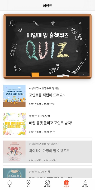하이타이 앱을 검색한 후 설치합니다. 안드로이드, 아이폰 다 설치 가능합니다. 어플을 설치했다면 회원가입을 해야 하는데 하이타이 앱은 애플과 카카오톡으로 연동하여 로그인이 가능합니다. 저는 카카오톡 로그인으로 진행했습니다. 회원가입 시 휴대전화까지 인증해야 정식으로 회원가입이 완료됩니다. 지금 하이타이를 가입해야 하는 이유가 있습니다. 바로 현재 신규가입 회원자들은 신규가입 시 1,000p를 받을 수 있습니다. 추천 코드 상관없이 모든 분들에게 1,000p 적립해주니 무조건 가입해야겠죠. 회원가입 후 자동 로그인까지 되면 개인정보에 민감하신 분들은 내 정보에 들어가서 프로필을 수정해주세요. 특히 카카오톡으로 연동하신 분들은 현재 카카오톡 내에 설정한 프로필 사진과 이름이 하이타이 내 정보로 똑같이 연동이 됩니다. 여기까진 진행한 후 앱테크 이벤트를 살펴보겠습니다. 하이타이 포인트 적립 방법 첫 번째는 출석체크입니다. 홈 화면 하단에 위치한 이벤트 탭으로 들어가서 꽝 없는 100% 당첨, 매일 룰렛 돌리고 포인트 받을 수 있는 출석체크 이벤트로 들어갑니다. 출석체크 이벤트 선물엔 10p, 50p, 100p, 신세계 상품권, 바나나우유, 스타벅스가 있습니다. 요즘 앱테크 시장이 활발해지면서 당첨을 위해 부정적인 방법을 쓰는 분들이 많다고 합니다. 특히 출석체크와 룰렛은 앱테크의 기본이라고 할 수 있는데 어뷰징을 이용한 사기수법으로 많은 분들에게 피해를 입히고 있습니다. 어뷰징과 같은 부정적인 방법은 당연히 불법이며 이로 인해 앱테크를 정직하게 참여하시는 분들에게 피해 가지 않도록 모두 공평하게 참여해줬으면 하는 간절한 바람이 있습니다. 어쨌든 하이타이로 다시 돌아와서 하이타이 룰렛 이벤트에도 부정적인 방법으로 당첨 시 당첨이 취소될 수 있다는 문구가 적혀있습니다. 포인트는 즉시 적립되지만 상품권, 기프티콘 같은 경우엔 최대 2주일이 소요될 수도 있다고 합니다. 그리고 두 번째는 홈 화면 상단에서도 볼 수 있는 매일매일 출첵 퀴즈입니다. 매일매일 출쳌퀴즈는 하루에 한 문제씩 매일 새롭게 출제되는 퀴즈 이벤트입니다. 정답을 맞힌 모든 분들에겐 50p, 추첨을 통해 매주 금요일엔 총 5명에게 스타벅스 기프티콘을 보내준다고 합니다. 매일 올라오는 이벤트임에도 불구하고 50p는 꽤 큰 액수입니다. 이벤트 기간은 정해져 있지 않고 예고 없이 종료된다고 하는데 아마 하이타이 앱테크를 몰라서 참여 안 하시는 분들이 많아 아직까진 큰 포인트를 주는 거 같습니다. 여기까지 누구나 적립할 수 있는 포인트 이벤트입니다. 세 번째는 하이타이를 이용한 분들에 한해서 받을 수 있는 포인트 이벤트입니다. 바로 제휴점 이용하고 후기를 작성하면 포인트를 적립할 수 있는데 앱을 이용하여 전화 걸고 하이타이 회원이라고 말해야 하이타이 회원가와 후기를 작성할 수 있습니다. 제휴점 이용 후 후기를 남기면 50p를 받을 수 있고 이렇게 모은 포인트는 5,000p이상부터 사용할 수 있습니다. 마사지 앱이라고 해서 마사지 예약 시 포인트를 사용하는 것이 아니라 하이타이 앱 내에 기프티콘 사용처가 따로 있어 스타벅스, 투썸플레이스, 이디야 등 다양한 쿠폰으로 교환할 수 있습니다. 하이타이는 아직까진 많이 알려지지 않은 앱입니다. 인기가 많아지면 포인트 적립 이벤트와 포인트 적립 금액이 언제 어떻게 변동될지 모르기 때문에 지금이 기회이니 꾸준히 참여해보시기 바랍니다.